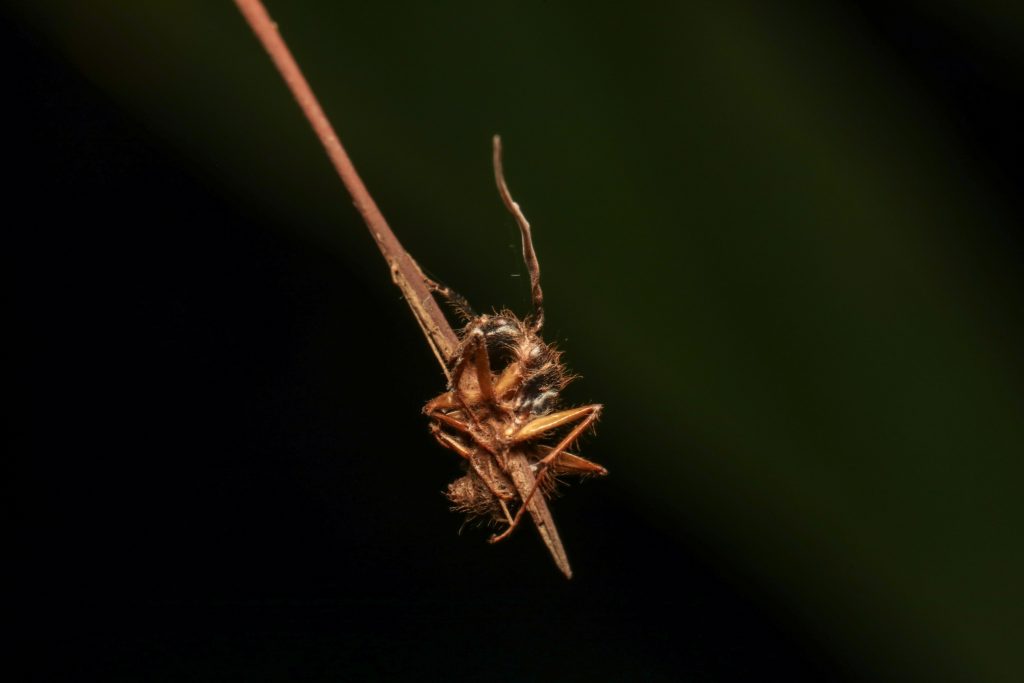 Uma formiga parasitada por um fungo está presa a um galho, evidenciando o ciclo da vida na floresta. Insetos na Mata Atlântica