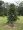 Árvore jovem de pequeno porte com folhagem densa e verde escura, localizada em um campo gramado, cercada por outras árvores ao fundo.