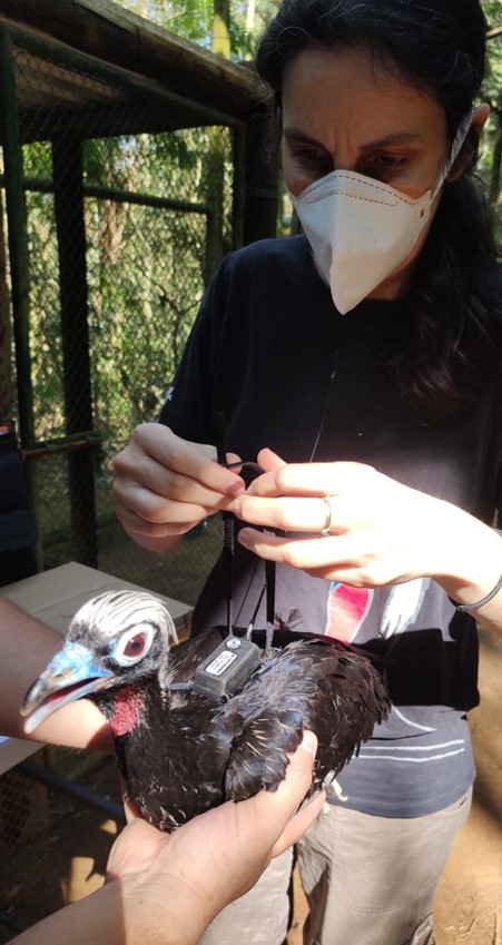 Alecssandra Tassoni, coordenadora do Projeto Jacutinga, prepara o transmissor em uma das aves. Foto: Equipe do projeto Jacutinga.