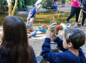 Educadora interage com duas crianças vestindo coletes de "Guardião da Mata Atlântica" em frente a um recinto de aves. Zoológicos