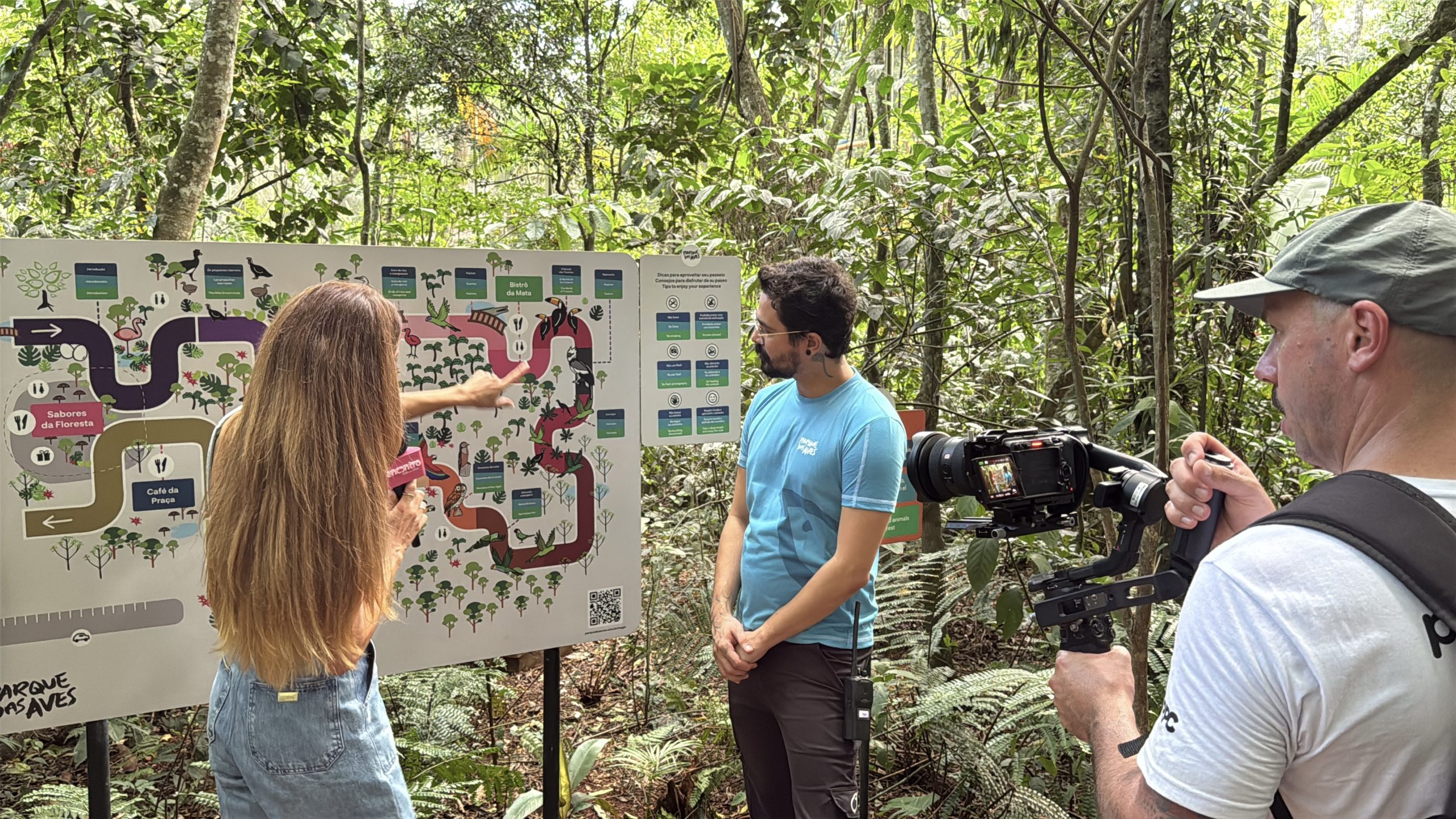 Durante a visita, a equipe do programa percorreu diferentes áreas do Parque das Aves, acompanhando de perto a rotina das equipes e os cuidados dedicados às aves. Foram apresentados aspectos do manejo, alimentação e bem-estar animal, além de momentos que evidenciam a relação entre os profissionais e os animais sob cuidados humanos.