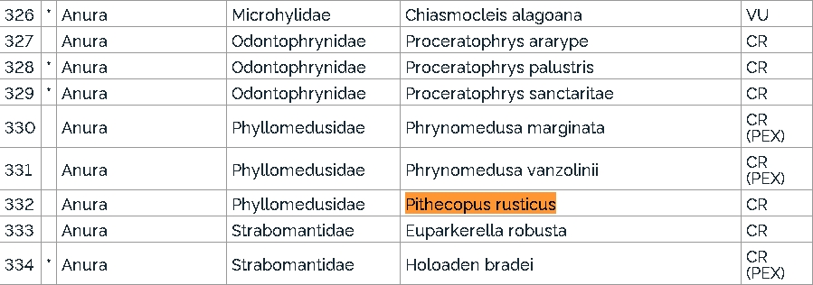 Captura de tela de uma tabela com nomes científicos de espécies e seus status de conservação. A tabela tem 8 linhas e 4 colunas. A primeira coluna é o número da linha, a segunda é a família ao qual pertence a espécie, a terceira é o nome da espécie e a quarta é o status de conservação. Os status de conservação são abreviados como VU para vulnerável, CR para criticamente em perigo e PEX para possivelmente extinto. O fundo da tabela é branco com texto preto e destaques em laranja. Os destaques em laranja estão nos nomes das espécies "Pithecopus rusticus", que é o nome científico da perereca-rústica. Ela se encontra na classificação CR, criticamente em perigo, que é a mais grave de todas.