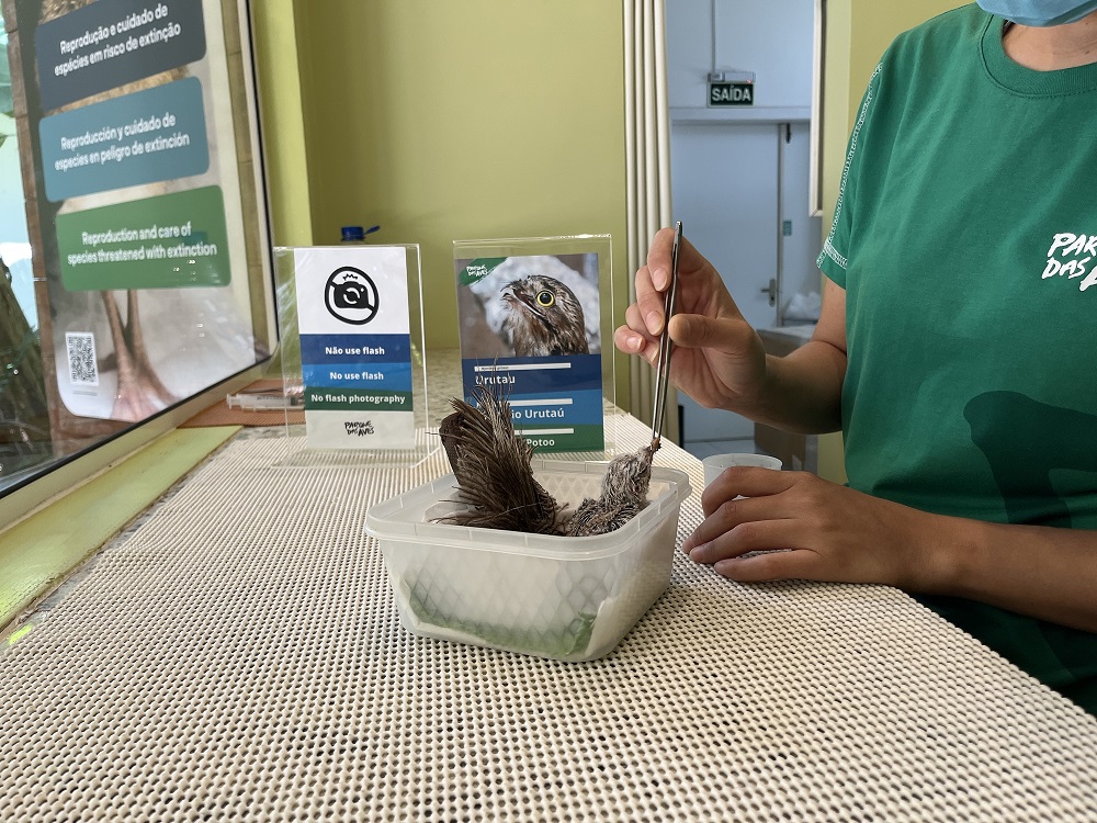 “Em 2023 comemoramos o nascimento inédito de um urutau sob cuidados humanos, que aconteceu feliz e coincidentemente no Dia da Ave, celebrado no dia 5 de outubro. No entanto, o filhote não resistiu e veio a óbito dias depois. Perder um animal sempre nos entristece, mas nos faz refletir sobre como podemos melhorar e ofertar cuidados ainda mais dedicados a outros animais. Foi justamente isso que nos motivou a realizar todo o processo de incubação, nascimento e alimentação desse segundo filhote sob os cuidados da nossa equipe. Até o sexto dia de vida, sua alimentação consistia em uma papinha desenvolvida pelo Henrique Tavares, zootecnista do Parque das Aves. A partir do sétimo dia, o urutau começou a ganhar alimentos sólidos de acordo com os hábitos alimentares da sua espécie”, explica Paloma.